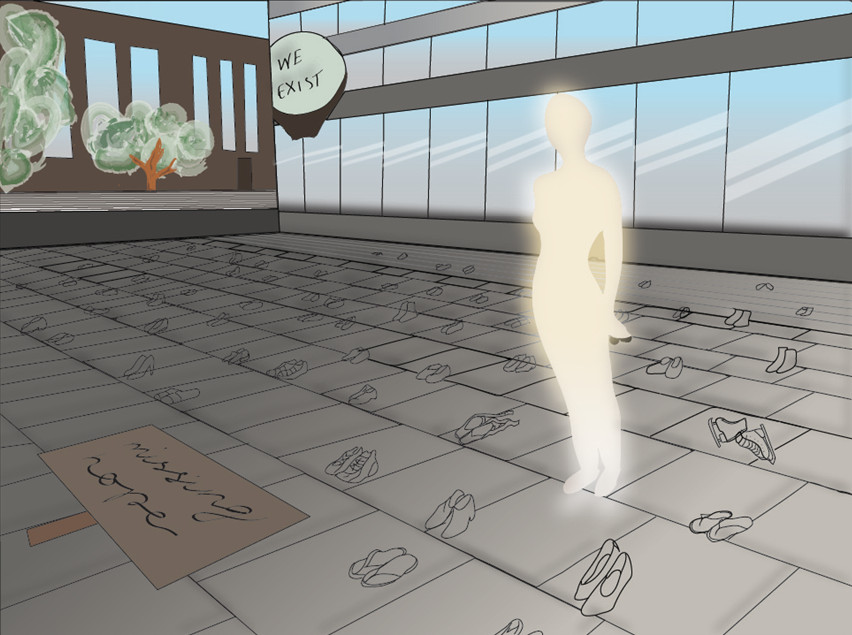 Bildet er inspirert av den globale Millions Missing protesten på ME-dagen. Skoene som er satt ut representerer personer som er rammet av ME og ikke har mulighet til å møte opp for å bruke stemmene sine. Protesten er en krig mot fordommer, og handler i korte trekk om å forlange forskningsmidler og oppmerksomhet, samt forhindre at historiene til ME-syke blir oversett og vasket vekk. En stor andel av de som rammes av sykdommen opplever å bli møtt med mistro og mistenkeliggjøring i samfunnet og i helsevesenet, og det ønsker jeg å utfordre.
